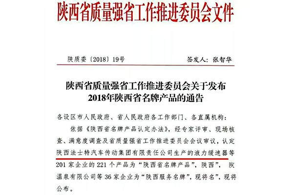 2018年12月27日獲悉,依據《陜西省名牌產品認定辦法》,經專家評審、現場核查、滿意度調查及省質量強省工作推進委員會會議審議,認定法士特生產的液力緩速器、離合器、同步器、齒輪軸類零件為“陜西省名牌產品”。