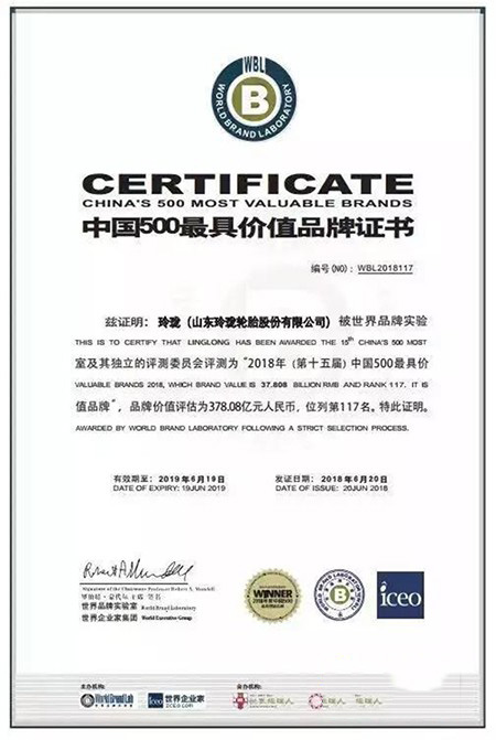 2018年6月20日,世界品牌實驗室在北京發布了2018年《中國500最具價值品牌》榜單。玲瓏輪胎品牌價值表現強勢,較2017年增長72.46億元,品牌價值高達378.08億元,位列中國500最具價值品牌榜第117名。并再次入圍亞洲品牌500強。玲瓏輪胎對于品牌價值的打造絕對首屈一指。