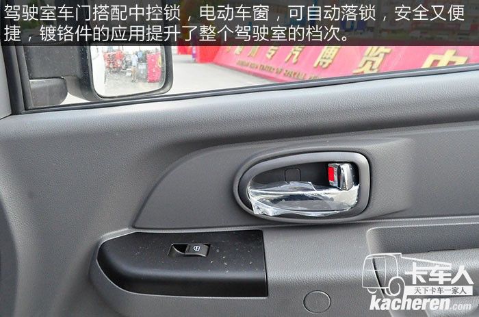 駕駛室車門搭配中控鎖,電動車窗,可自動落鎖,安全又便捷,鍍鉻件的應用提升了整個駕駛室的檔次。