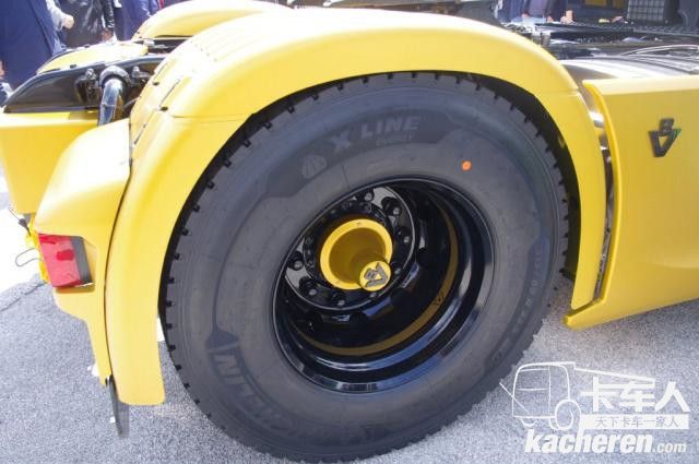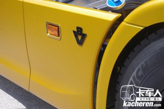 除了裙板帶有V8標識外,驅動橋軸頭處也帶有同樣的標識。輪轂采用啞光黑色,與裙板、擋泥板的金色遙相呼應。每個細節都彰顯著斯堪尼亞對V8發動機歷史的回眸以及對未來的新展望。