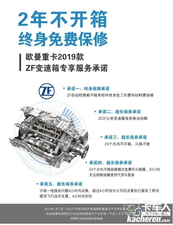 其實(shí),對(duì)于國內(nèi)卡友還是新鮮事物的自動(dòng)擋重卡,對(duì)歐美卡友來說早已是標(biāo)配。在售后使用過程中,不少卡友擔(dān)憂費(fèi)用過高以及維修保養(yǎng)是否及時(shí)等問題。為打消用戶的后顧之憂,福田戴姆勒汽車針對(duì)歐曼自動(dòng)擋重卡推出省油承諾、終身質(zhì)保承諾、不開箱服務(wù)承諾、最長保修承諾、超長保養(yǎng)承諾、免費(fèi)外出救援服務(wù)六大承諾。此外,歐曼EST-A超級(jí)重卡整車160萬公里無大修,變速箱的換油周期達(dá)到20萬公里,2年不開缸不開箱的品質(zhì),也是歐曼敢于做出承諾的自信,彰顯著歐曼EST-A超級(jí)重卡是一款真正可以讓用戶放心買、放心用的自動(dòng)擋重卡。
