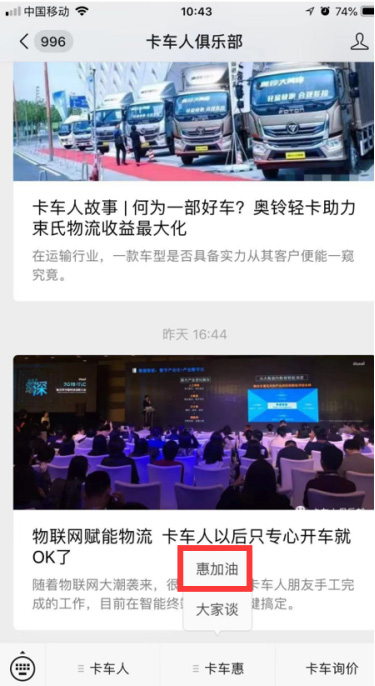 關注卡車人俱樂部微信號,可以獲得全國數萬網點優惠加油資源。一鍵加油,無論在哪里,打開“卡車人俱樂部”微信訂閱號,點擊“惠加油”,即可查詢到最近的“惠加油”指定加油站。