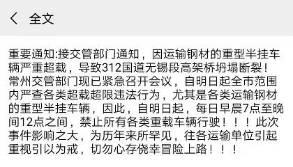 除此之外,據(jù)卡友表示,接常州交管部門通知,自今日起全市范圍內(nèi)嚴(yán)查各類超載超限違法行為,尤其是各類運(yùn)輸鋼材的重型半掛車輛,因此,自今日起,每日早晨7點(diǎn)至晚間12點(diǎn)之間,禁止所有各類重載車輛行駛。