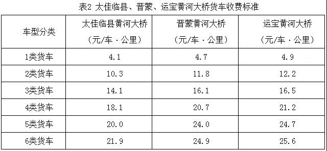 2.太佳臨縣、晉蒙和運(yùn)寶三座獨(dú)立橋梁收費(fèi)標(biāo)準(zhǔn)。
