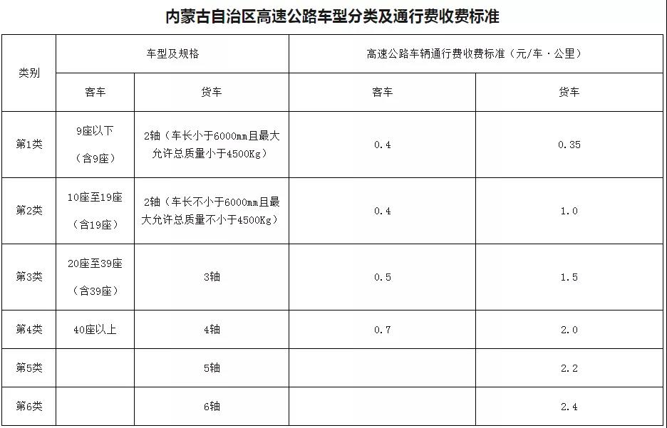 高速公路車型分類及車輛通行費(fèi)收費(fèi)標(biāo)準(zhǔn)按照《內(nèi)蒙古自治區(qū)高速公路車型分類及通行費(fèi)收費(fèi)標(biāo)準(zhǔn)》執(zhí)行。具體內(nèi)容可參照下表: