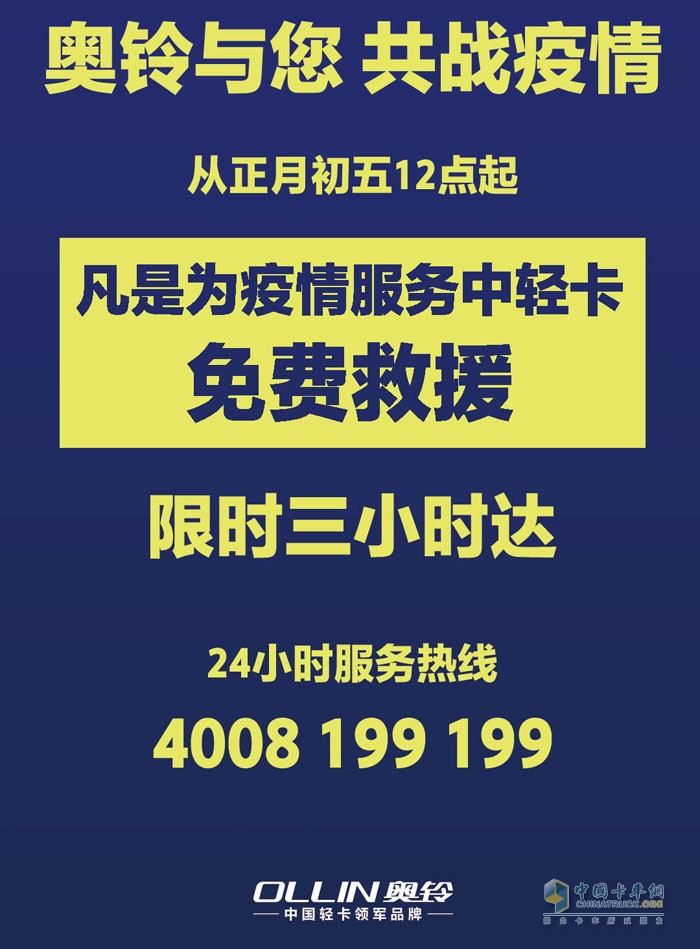 劃重點的是,從農歷正月初五12點起,凡是為疫情服務的中輕卡車型,無論是什么品牌,福田奧鈴全部免費救援。這一行動,無疑為奮戰在疫情第一線的中型、輕型卡車的運輸給予了有利的保障。