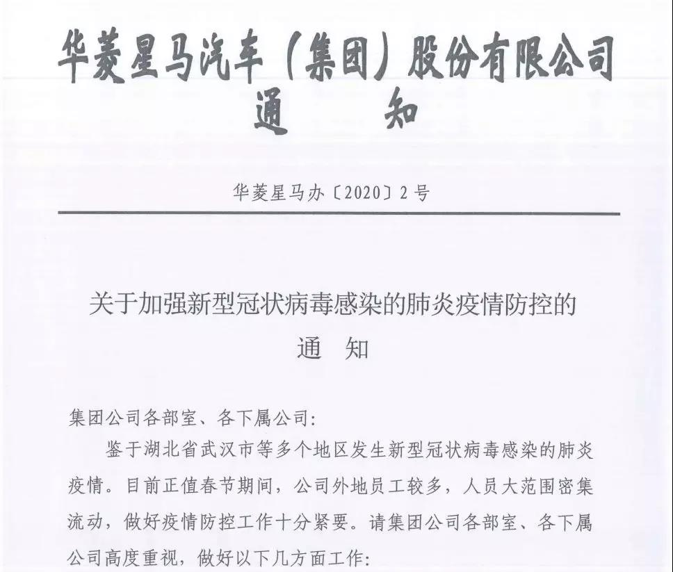 生命重于泰山,防疫刻不容緩。1月22日,華菱星馬集團下發《關于加強新型冠狀病毒感染的肺炎疫情防控的通知》,要求各部室、各下屬公司高度重視,統計和上報本部門、企業員工是否傳染病毒及整體防控情況;通過微信、QQ工作群,及時向所有員工宣講疫情防控最新精神,做到講衛生、戴口罩、強體魄、多配合、早報告、早治療,堅決杜絕瞞實情、湊熱鬧、吃生食、信謠言;積極落實防控措施,加強人員監控,對重點人群、重點區域、重點情況做到早發現、早報告、早處置,確保無遺漏、無死角。目前,全集團未發現有職工確診感染情況。一方有難八方支援。相信在各界人士全力抗擊下,我們一定能夠早日戰勝疫情。華菱星馬也將繼續密切關注疫情發展,把疫情防控工作作為當前最重要的工作來抓,全面安排部署,積極作為、快速行動,努力擔當企業的政治責任和社會責任,全力做好疫情防控工作。