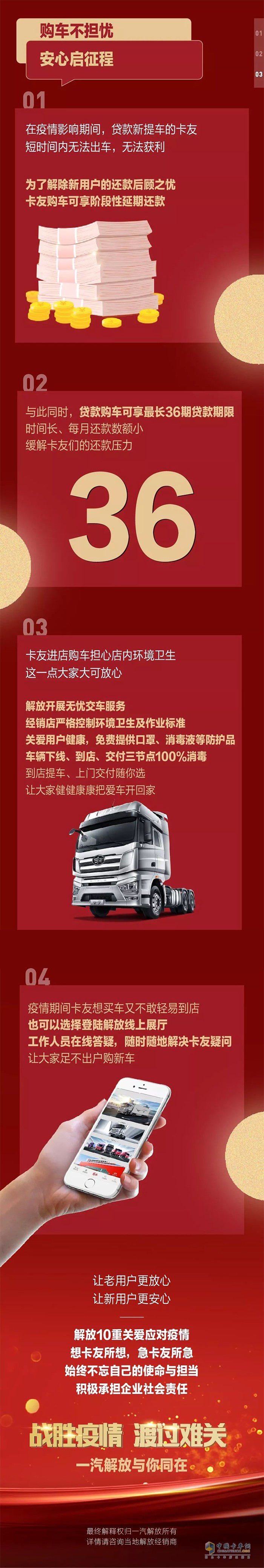 疫情影響,開工延期,為解決卡友最緊急而迫切的需求,已貸款購車的解放用戶,若受疫情影響嚴重,可享受階段性延期還款,免除卡友后顧之憂。