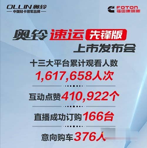 2020年3月30日,0利息0首付0擔保--奧鈴速運先鋒版產品線上上市了,上市當天通過福田奧鈴官方微信、抖音號等十三大平臺直播,累計觀看人數超160萬人次,成功購車166臺,意向購車達376人,賺錢先鋒的實力赤裸裸,這也不無說明福田奧鈴這樣施策的正確性。