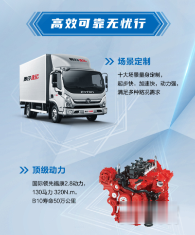 該產品由福田奧鈴與福田康明斯合作,根據城市配送實際運營工況調校的同時,通過大量調研可為日用百貨、快遞包裹輕拋貨客戶定制,整車與發動機一體化優化匹配更優,實現可靠性、動力性的完美兼顧。