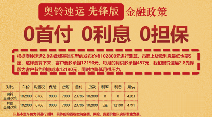 一款先鋒產品,外加升級服務做后盾,用戶購車的后顧之憂解決了,那當前之急就是怎樣解決用戶復工購車資金難的痛點。為此,福田奧鈴又推行業第一個0首付0利率0擔保的金融產品。該3“0”的金融產品面向所有用戶,購車只需交納相應購置稅和保險,即可把車開回家,不用為沒錢買車而發愁。并且2年貸款0利息,奧鈴貼息最高1萬元并且不需要擔保,由奧鈴承擔風險,最快24小時就可以放款,這真是史無前例的優惠。