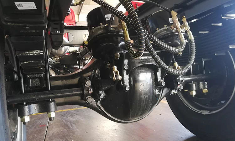 前橋采用漢德MAN4.8噸輕量化盤式前軸,最大制動力矩28000N·m,德國FAG軸承單元,50萬公里免維護(hù),免扒輪轂;后橋制動蹄片寬度220mm,制動效果及熱衰退性能好,制動安全性高。