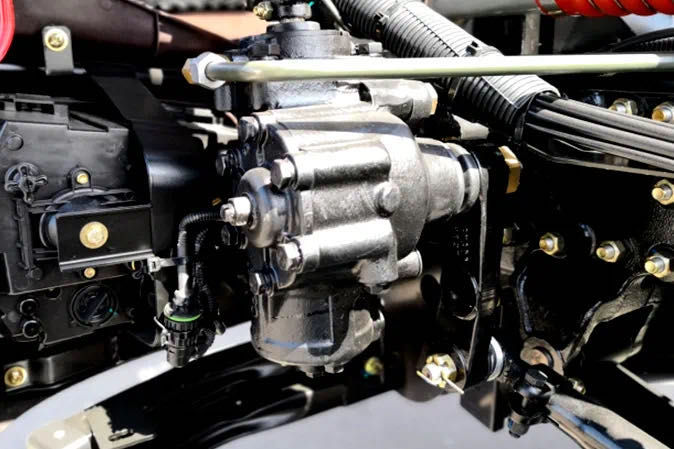 大缸徑轉(zhuǎn)向器,前軸轉(zhuǎn)向角46°,轉(zhuǎn)彎半徑小,狹窄空間轉(zhuǎn)彎方便。