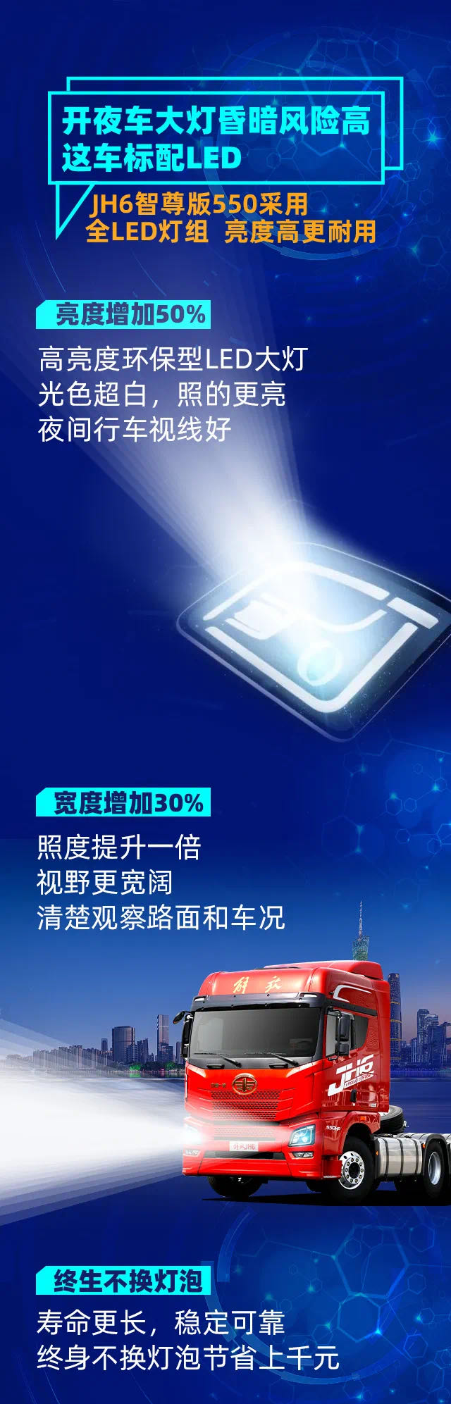 夜間光線暗,視野不足開車不好開?一汽解放青汽JH6全新智尊版550,標配“解放之光”LED大燈,更炫酷、更明亮、更安全,讓你夜間行駛也猶如白天,掙錢的路上更寬亮!