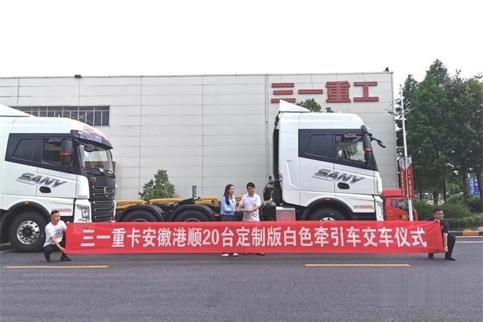 三一重卡安徽港順20臺定制版白色牽引車交車儀式