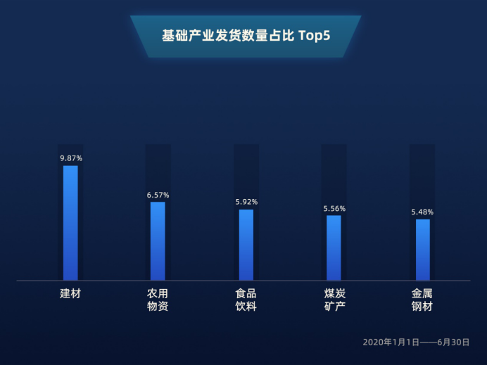 2020年1月1日至6月30日,滿幫貨運(yùn)平臺(tái)數(shù)據(jù)顯示,在基礎(chǔ)產(chǎn)業(yè)的貨物類型中,以建材、煤炭礦產(chǎn)、金屬鋼材為代表的第二產(chǎn)業(yè),排在上半年發(fā)貨數(shù)量的前列。以農(nóng)用物資、木材苗圃、蔬菜為代表的第一產(chǎn)業(yè)貨品緊隨其后。