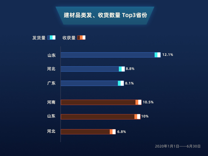 其中,建材訂單量占據(jù)基礎(chǔ)產(chǎn)業(yè)第一位,與去年同期相比,上升25.9%。根據(jù)國(guó)泰君安證券研究所已發(fā)布的研究報(bào)告分析,疫情對(duì)建材行業(yè)整體影響有限,原因是疫情對(duì)經(jīng)濟(jì)形成沖擊后,基建將成為穩(wěn)經(jīng)濟(jì)的重要舉措。以山東省發(fā)貨數(shù)量排名第一、收貨數(shù)量排名第二,河北省發(fā)貨數(shù)量第二、收貨數(shù)量排名第三的數(shù)據(jù)來(lái)看,顯示了山東及河北兩省強(qiáng)健的生產(chǎn)能力,以及基礎(chǔ)建設(shè)需求旺盛的特點(diǎn)。