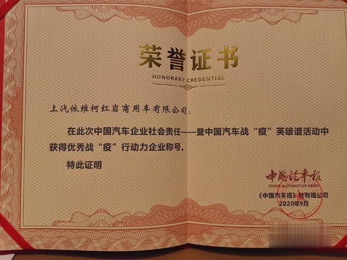 敢于擔(dān)當(dāng)上汽紅巖榮獲“優(yōu)秀戰(zhàn)‘疫’行動(dòng)力企業(yè)”大獎(jiǎng)