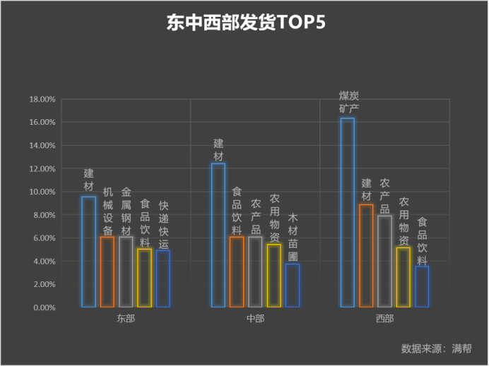 在貨品豐富程度上,東部發貨類型相對更為多元化,既有建材、機械,又有食品飲料及快遞快運,反映出其產業與經濟的多元化。