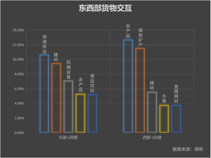 東西部通過貨運產生了怎樣的交互?東部發往西部的前5類貨品分別是快遞快運搬家、建材、機械設備、農產品和食品飲料,西部發往東部的前5類貨品分別是農產品、煤炭礦產、建材、水果和金屬鋼材。總體看,西部往東部輸送原材料,東部向西部輸送深加工以及消費類產品,滿足西部的消費需求。
