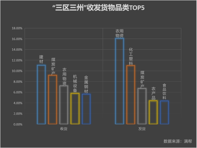 “三區三州”主要生產什么,又需要什么?該區域發貨前5分別為農用物資、化工塑料、煤炭礦產、農產品和食品飲料,以第一產業與原材料為主;收貨前5則分別為建材、煤炭礦產、農用物資、機械設備和金屬鋼材。