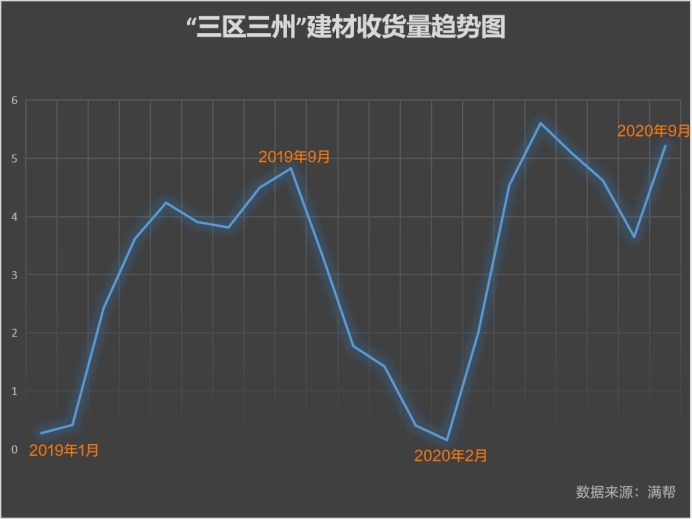 我國是基建大國,加之近年來城市化進程不斷加速,帶來大量建材運輸需求。滿幫大數據顯示,建材在各地收貨比例幾乎都位列第一,“三區三州”呈現出同樣的特點,建材收貨占比位居首位,高達11.08%,高于西部平均的10.32%。2019年至今,除疫情影響之外,建材的收貨量一直處上升態勢。