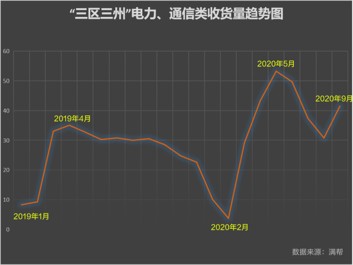 自2019年1月至今,除疫情影響之外,“三區三州”的“電力設備”、“電工通信材料”收貨量一直處上升態勢,且在疫情中反彈十分迅速。