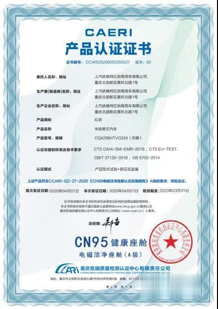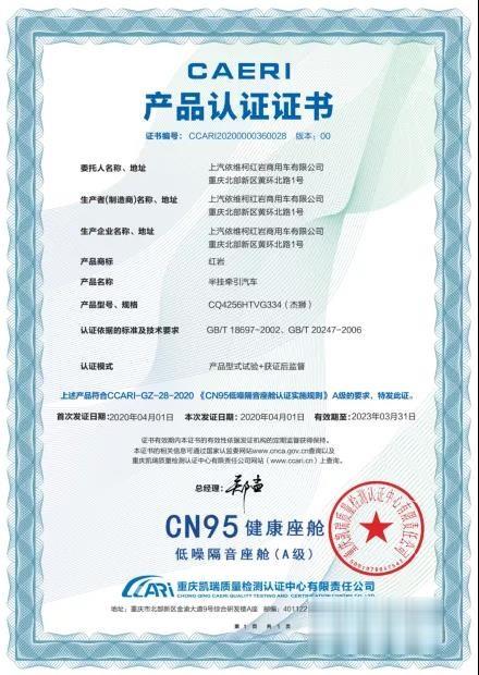 更厲害的是,上汽紅巖還是中國首批獲批“中汽研”嚴(yán)格檢測頒發(fā)的“CN95健康座艙”認(rèn)證的商用車企,紅巖杰獅2020牽引車更是獲得了“電磁潔凈”,“低噪隔音” 雙維度最高等級A級認(rèn)證。