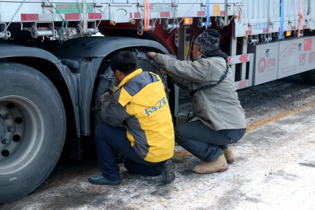 然而效果并不理想,隨即大家決定為車輛安裝防滑鏈,這是面對此種路況最行之有效的辦法,隨后車輛在慢慢的騰挪中爬上了這半公里的結(jié)冰路段。