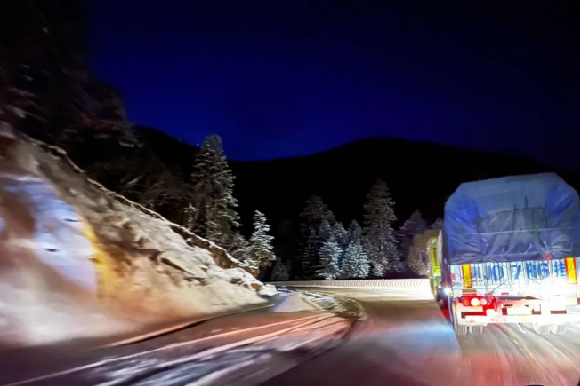 托子拉峰路段最高處海拔達到了4200米,在隨后迎來的長下坡路段全是冰雪堆積,并且彎道多,特別考驗車輛的穩(wěn)定性。四臺鑼響新國標掛車均裝配了重器抗翻空懸,通過氣囊調(diào)節(jié)左右懸架高度,使貨箱保持穩(wěn)定,防止貨物出現(xiàn)側(cè)傾現(xiàn)象。而此時的超級盤剎也在配合著ABS系統(tǒng)工作,最后1號車就是依靠單純的剎車系統(tǒng),勻速安全通過了這條冰雪長下坡路段。