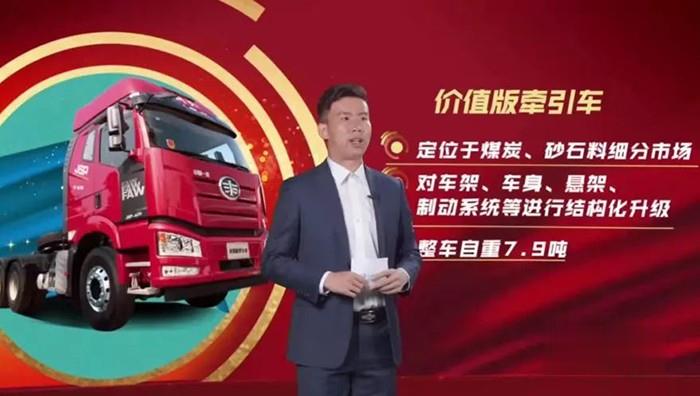 一汽解放市場部產品戰略室產品研究工程師范迪先生,在直播間向大家介紹了兩款2021年解放將重點推廣的新產品,第一款是500馬力的質惠版牽引車,標配四方位影像和油箱防盜功能,標配50萬公里免維護康邁輪端,標配800L油箱,選裝雙500L油箱,動力提升更是讓這款市場表現優秀的產品產生了質的飛越。