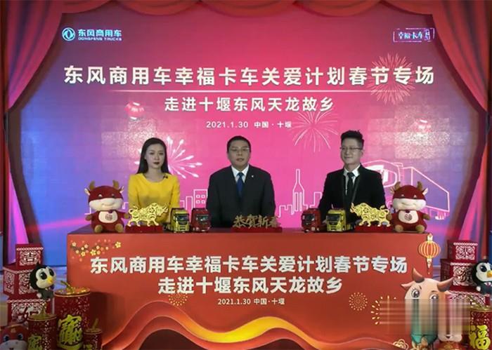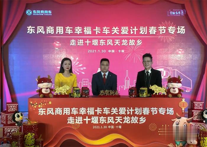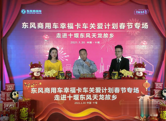 2021年1月30日,繼首站走進河南偃師“東風天龍村”后,東風商用車幸福卡車回到東風天龍的故鄉、東風商用車的發祥地——湖北十堰,通過線上直播的形式,為全國卡友送上了祝福和關愛。東風卡車、東風商用車抖音和快手4家官方平臺以及其他4家行業和地方媒體平臺參與直播,超過218.66萬人次收看,1.3萬卡友點贊。