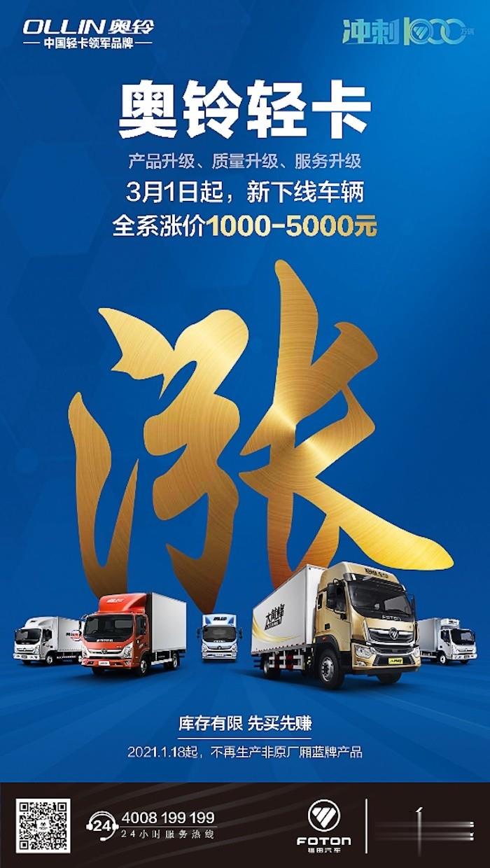 中國卡車網記者2021年2月19日獲悉,自3月1日起,奧鈴輕卡新下線車輛全系產品價格將上調,根據不同車型和配置上調幅度為1000-5000元。
