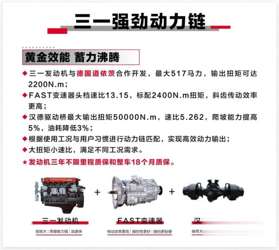 作為工作伙伴,首先要實力可靠,才能贏得用戶信賴。在三一重工本身“世界級”研發(fā)、制造、服務(wù)能力加持下,大家對新車“產(chǎn)品力”自然無需多慮。包括此前三一與德國道依茨合作開發(fā)的三一道依茨發(fā)動機,延續(xù)了道依茨在節(jié)油、耐用、動力方面的強勁表現(xiàn),最大517馬力,輸出扭矩可達(dá)2200N·m,同時還推出“三年不限里程質(zhì)保”。可以說,“歐系血液”+給力服務(wù)為車輛帶來了更可靠的出勤保障,筆者猜測部分新車將繼續(xù)搭載由三一發(fā)動機+法士特變速器+漢德橋組成的黃金動力鏈。
