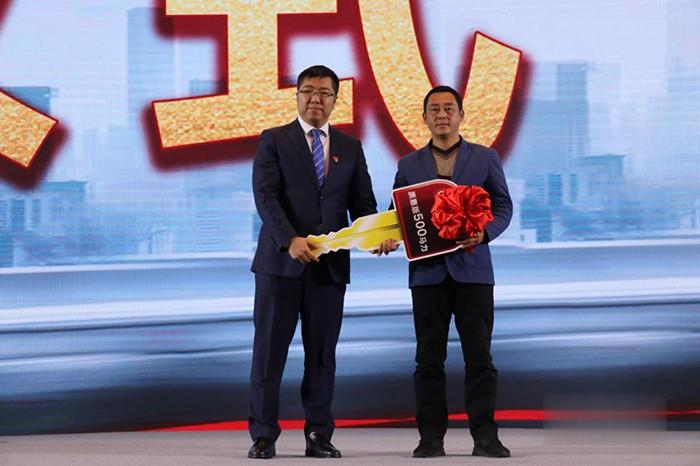 一汽解放銷售公司市場部部長邵延德(左)為張玉寶遞上致富鑰匙