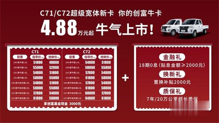 2021年4月27日,東風小康以一場“史上最牛氣“的發布會直播,宣告超級寬體新卡C71/C72正式上市。為滿足用戶多元化購車需求,新車共推出多款配置,官方指導售價區間為5.18-6.48萬元,配備同級別更大超長超寬貨箱,搭載行業領先2.0L/1.6L大排量發動機,采用領先同級的承載式新卡結構為用戶帶來更安全、更舒適的駕乘保障。即日起購車,前一萬名用戶可享創富基金現金3000元“搶鮮禮”,并享受最低2000元貼息補貼“金融禮”、2000元置換補貼“換新禮”、7年/20萬公里超長質保“質保禮”等多項優惠政策,新車搶鮮價低至4.88萬。