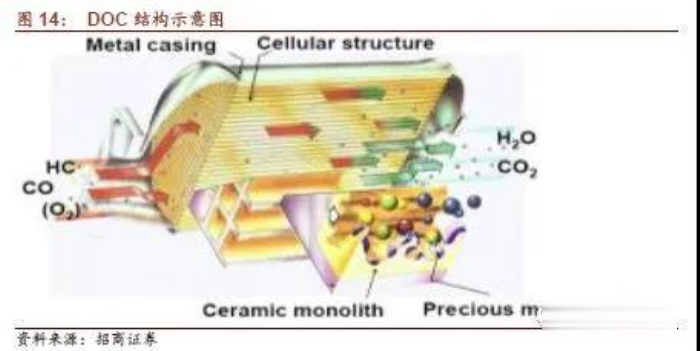作用是凈化尾氣中的一氧化碳和碳?xì)浠衔?。DOC整個后處理過程的第一步,一般以金屬或陶瓷作為催化劑的載體,涂層中主要活性成分是鉑、鈀等貴金屬與稀土金屬。