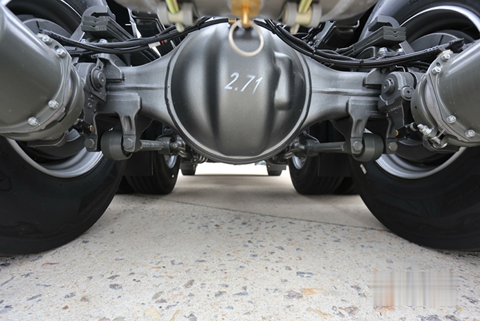 底盤方面,豪沃TH7犇贏版采用的是重汽MCY 輕量化車橋,速比為2.71。車架是采用德國MAN高強度車架設計,匹配前后少片鋼板彈簧設計,在保障承載力的前提下,科學降重,自重僅為8.1噸,滿足自重輕、承載力強、多拉多賺等市場需求。