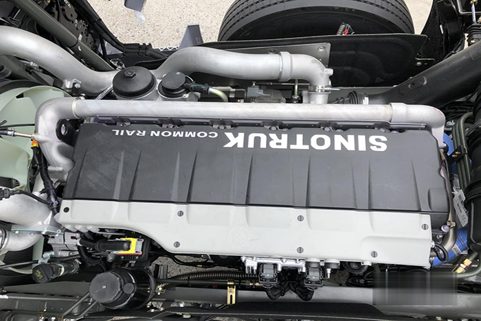 底盤動力方面,這款豪沃TH7犇贏版搭載MC13H國六發動機,570馬力,峰值扭矩2700N.m,滿足國六排放標準。