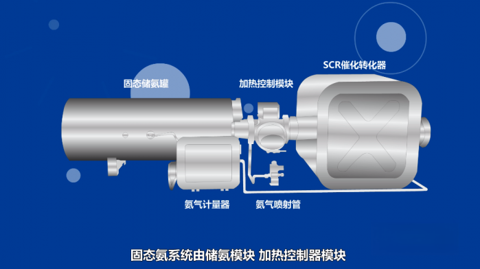 固態氨系統是解放獨有專利技術,其工作原理與尿素一樣,都是利用氨氣將尾氣當中的氮氧化物生成無害的氮氣和水,讓車輛尾氣排放達標。但不同于尿素先水解再解出氨氣,固態氨是將氨氣以固態形式存儲在儲氨罐內,直接通過尾氣加熱釋放氨氣,不僅低溫區轉化效率比尿素高約40%,更解決了低溫尿素無法充分水解導致的結晶問題,避免了低溫條件下限扭、限速問題。而且固態氨系統結構更簡單,沒有尿素噴嘴、尿素泵這樣的精密件,也不存在堵塞噴嘴的問題。