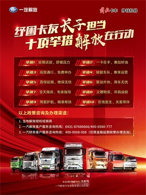 在疫情多點復發的低迷環境下,眾多卡車用戶運營面臨巨大的挑戰與壓力,部分卡車無活可干、無錢可賺,特別是那些需要按期償還車輛貸款的卡車司機,生活處境變得異常艱難。除了率先在全國各地開展關愛活動外,一汽解放還堅決落實國務院國資委要求,扛起汽車央企責任,第一時間下發實施細則,助力物流運輸行業紓困解難。面向廣大用戶,一汽解放推出了6個月延期還本付息政策,同時圍繞客戶運營及生活場景難點,一汽解放還推出了力度空前的“卡友紓困十項舉措”,積極幫助卡友解決車貸及養車問題,努力推動社會經濟回歸正常軌道。