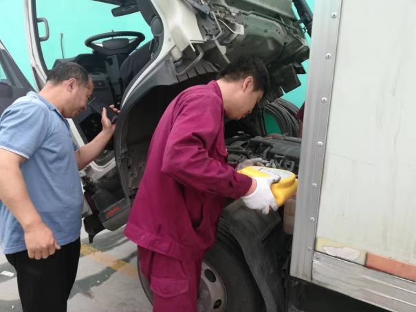 7月14日早上7點(diǎn)左右,在山東今麥郎青州總代理的倉(cāng)庫(kù)停車場(chǎng),江淮1卡濰坊東虹云內(nèi)服務(wù)站的維修師傅正在為車輛進(jìn)行全方位的檢修服務(wù),檢修項(xiàng)目包括制動(dòng)系統(tǒng)、空調(diào)系統(tǒng)、故障碼檢查、油液檢查等。對(duì)于檢修中發(fā)現(xiàn)的簡(jiǎn)單問(wèn)題現(xiàn)場(chǎng)處理,無(wú)法現(xiàn)場(chǎng)處理的問(wèn)題詳細(xì)記錄后進(jìn)站處理。