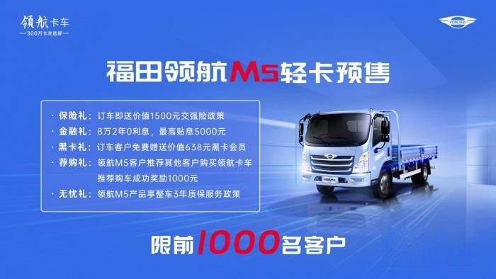 值得一提的是,福田領(lǐng)航M5已在福田e家、領(lǐng)航卡車官網(wǎng)、抖音官方號、中國卡車網(wǎng)等多個平臺開啟預(yù)售,前1000名客戶預(yù)約購車的卡友即可享五重政策豪禮。