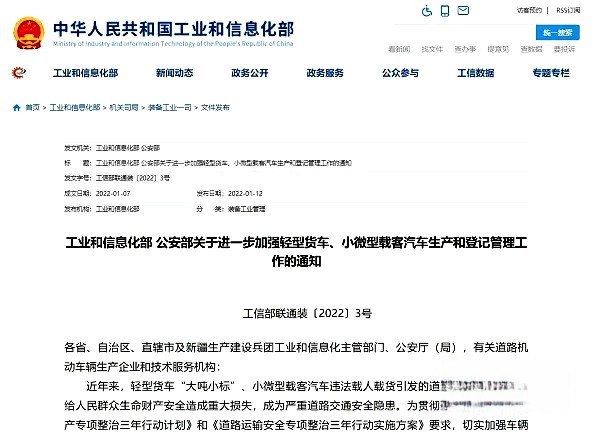 2022年1月13日,工信部、公安部聯(lián)合發(fā)布《關(guān)于進(jìn)一步加強(qiáng)輕型貨車、小微型載客汽車生產(chǎn)和登記管理工作的通知》,對輕型貨車、小微型載客汽車等車型的生產(chǎn)制造以及使用進(jìn)行了規(guī)范?!锻ㄖ穼p型貨車的技術(shù)參數(shù)做了明確要求,例如發(fā)動機(jī)排量不大于2.5L、輪胎名義斷面寬度不超過7.00in(英制)、貨廂內(nèi)部寬度不大于2100mm等。