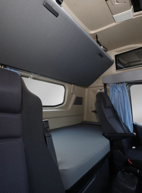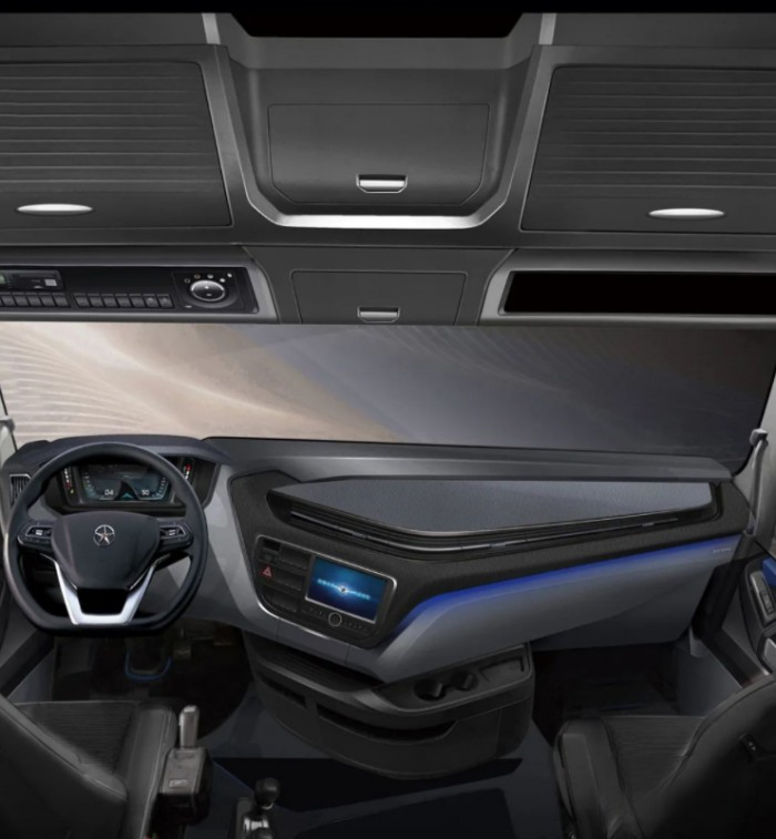 大運V9的超大平地板駕駛室,內部高度達到2040mm,在車內可自由活動。主駕配備了可調節氣囊座椅,自帶雙級腰托和電加熱、通風功能。后排寬體臥鋪、超過1000L的儲物容量、車載冰箱、220V生活電源等滿足生活所需的小細節,老丈人都夸“和家一樣舒適”。