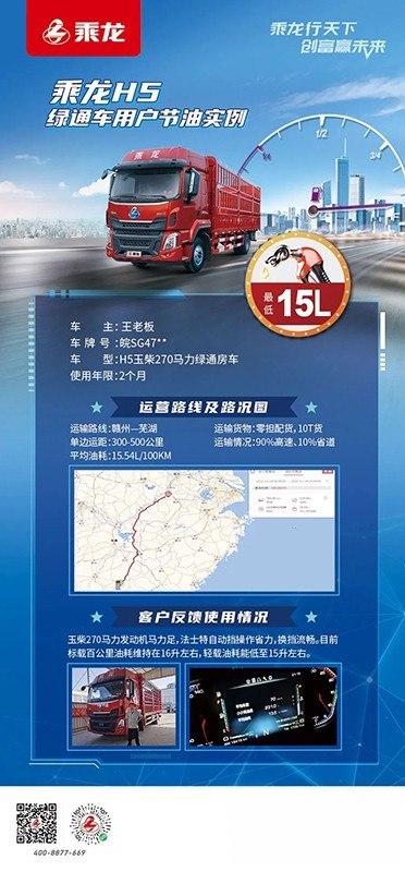 近年來油價頻繁波動,居高不下,一輛省油的好車必不可少,王老板從贛州到蕪湖,單邊運距300-500公里,平均油耗僅為15.54L/KM!如此優秀的油耗表現,得益于乘龍H5綠通房車的高效低油耗發動機和低阻力駕駛室及輪胎技術。高效率動力鏈,精準電控發動機,高效能熱循環發動機燃燒更充分,整體化設計風阻更低,油耗更省。新的一年,王老板也將與乘龍H5玉柴270馬力綠通一起奔赴新錢程!