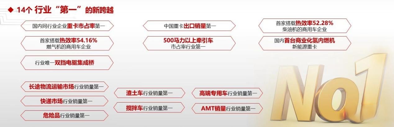 2022年,中國(guó)重汽整車(chē)銷(xiāo)量實(shí)現(xiàn)24.9萬(wàn)輛、收入突破1214億元,是行業(yè)銷(xiāo)量最高、市場(chǎng)下滑最少、運(yùn)行效益最好的企業(yè),行業(yè)龍頭地位持續(xù)穩(wěn)固,并實(shí)現(xiàn)了14個(gè)“第一”。