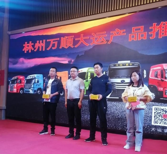 活動開始,分別由大運重卡河南大區經理倪世界和林州萬順總經理李懷軍致開場辭,感謝林州當地卡友多年以來對大運重卡的支持。大運重卡在林州地區深耕11年,在當地有不錯的口碑和客戶基礎,這次活動大運重卡帶來了燃氣車的全系V7、N8E、N9H產品來滿足當地客戶的不同需求,并給客戶定制了優惠的購車方案。