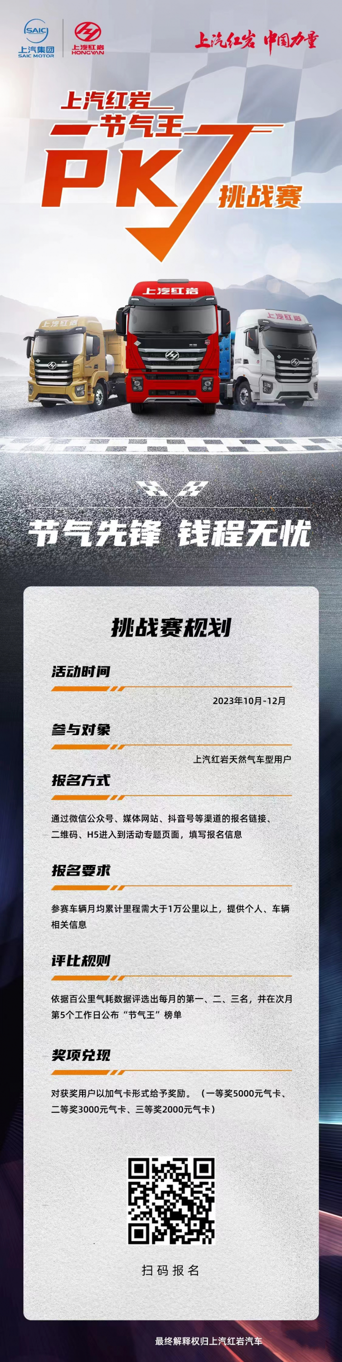 報名方式:上汽紅巖天然氣重卡用戶通過線上(微信公眾號、媒體網站、抖音號等渠道的報名鏈接、二維碼、H5)進入到活動專題頁面,在每月最后1個自然日前上傳相關報名信息后,即為參賽。