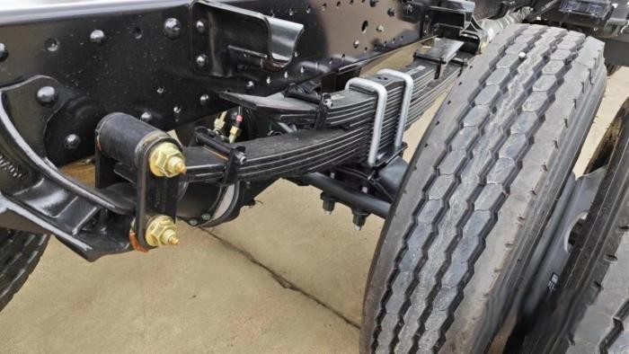 車架寬度由750mm加寬至760mm,車架材質(zhì)強(qiáng)度由510L升級(jí)為610L,抗拉強(qiáng)度610-700MPa,屈服強(qiáng)度應(yīng)大于390MPa,車身強(qiáng)度更高,行駛更穩(wěn)定。輪胎由5孔升級(jí)為6孔,板簧可以選5+2少片簧/8+6多片簧,承載能力顯著提升。